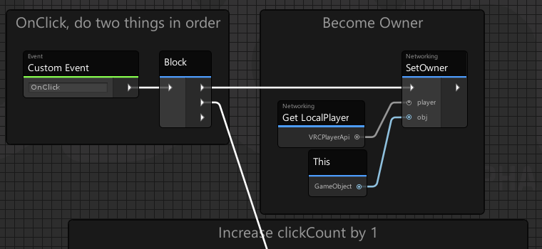 In the Graph Program, the OnClick event checks whether the player who clicked is the Owner of the object. If they are, it increases the "clickCount" variable by 1 and then calls RequestSerialization, which signals Udon to update the data on this Manual-synced UdonBehaviour.