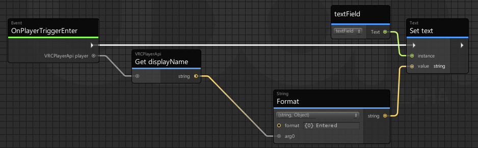 In this program, the OnPlayerTriggerEnter and OnPlayerTriggerExit events are triggered whenever any player enters or exists the collider. The program then gets the displayName of that player and updates the text on the target canvas.