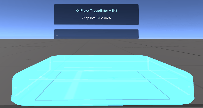 This is the most commonly used way to detect a player entering or leaving an area. The "TriggerArea" object has a see-through blue material on it, a Box Collider with IsTrigger checked, and an UdonBehaviour with a PlayerTrigger program source.