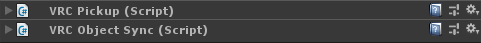 This object has two important components on it - and UdonBehaviour with a PickupAndUse program and a VRCObjectSync component. The Object Sync component will sync the movement of this object to other users, and the PickupAndUse program changes the color of the cube's material when the "Use" button is pressed, by listening for OnPickupUseDown and OnPickupUseUp events.