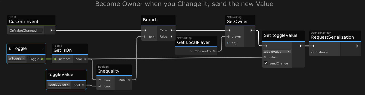 This object has a program called ToggleSync which works the same as the Slider above. When someone changes the value to something Inequal to the current value, they become the owner, and send the new value to everyone else,