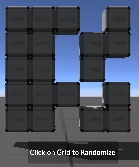 When anyone clicks on the object containing all the cubes, a Custom Network Event called "Randomize" is sent to the owner of the CubeArraySync object. The owner then uses a For loop to randomly set each value to on or off, by generating a number between 0 and 1 and checking if that value is greater than 0.5. Once it updates the array variable, it calls RequestSerialization and then calls the custom event UpdateCubes.
