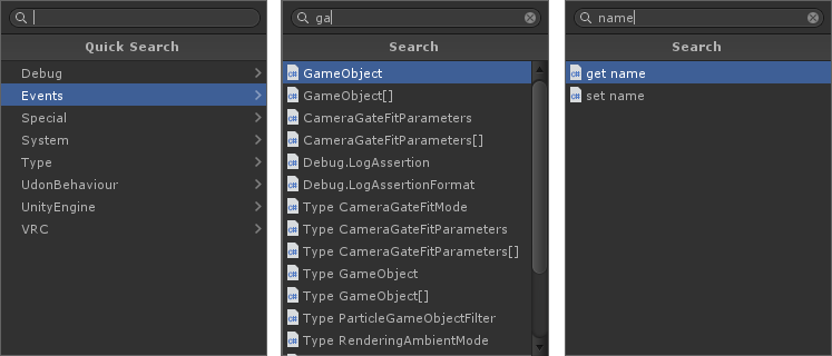 Press Tab to open up Full Search, then you can search for any method on any object. For GameObject.GetName, you could just search for 'getname' and see all the objects that have a way to get the name of the object. You could also search directly for 'gameobject.getname' and you will be directed to exactly the right node. This search method is slower than Quick Search, so it should be used only when you're not sure which class to look for in Quick Search.