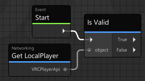 在您尝试玩家的获取或者修改任何东西,请确保 IsValid 返回 true。如果一个玩家已经离开了事件但是您依然在引用这个玩家对应的 VRCPlayerApi 对象,则会返回 false。为了更方便地在节点图中使用,请搜索通用的“IsValid”方法,该方法适用于任何对象,因为它为“true”和“false”提供了单独的流程。