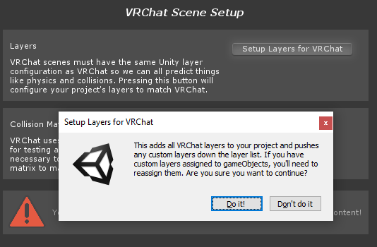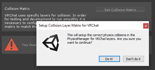 - Switch to the 'Builder' tab. We need to set up our Layers and Collision Matrix to the way that VRChat expects. Just press the 'Setup Layers for VRChat' button, then 'Do it!' on the popup that appears.