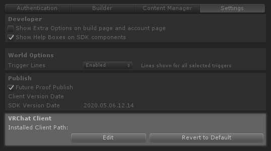 Click on the Settings tab and look for the 'VRChat Client' entry at the bottom. This is the VRChat Client that Unity will use to test your worlds. If you don't set this, your worlds may not launch correctly.